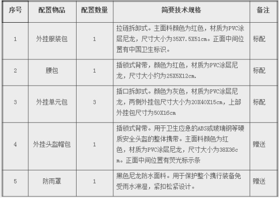 主面料采用國旗紅色,并符合《衛(wèi)生應(yīng)急毒物個人攜行裝備技術(shù)規(guī)范(試行)》相關(guān)規(guī)定。內(nèi)部單元包采用綠色,外掛包采用灰色。