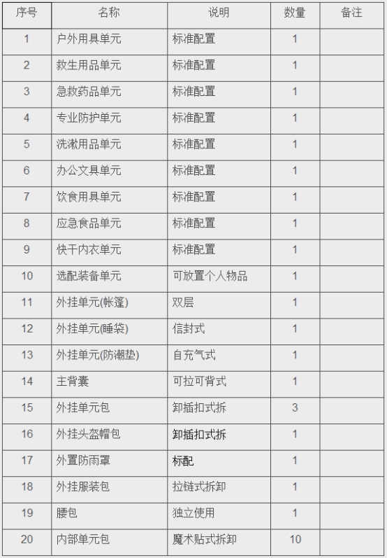 個人衛(wèi)生應(yīng)急裝備,是按照《衛(wèi)生部衛(wèi)生應(yīng)急裝備參考目錄(試行)》要求“衛(wèi)生應(yīng)急指導(dǎo)函[2011]193號”,國家大型衛(wèi)生應(yīng)急救援工作的經(jīng)驗研制開發(fā)。該裝備采用“1+X”設(shè)計理念,“1”是個人攜行基本裝備,“X”是特殊工作環(huán)境的選配單元。裝備主要由主包和幾個外掛包組成,主包內(nèi)有幾個不同功能的應(yīng)用單元包,外掛包用于放置帳篷、睡袋、自充氣墊、安全頭盔包等體積較大的物品。