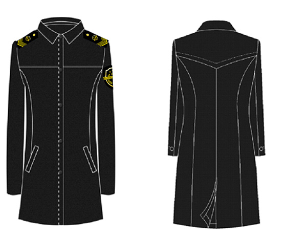 說明:春秋服、冬服均為毛滌混紡面料,顏色為黑色。上衣為小翻領(lǐng)西服式樣,單排三粒扣,兩個暗口袋;西褲為簡褲。